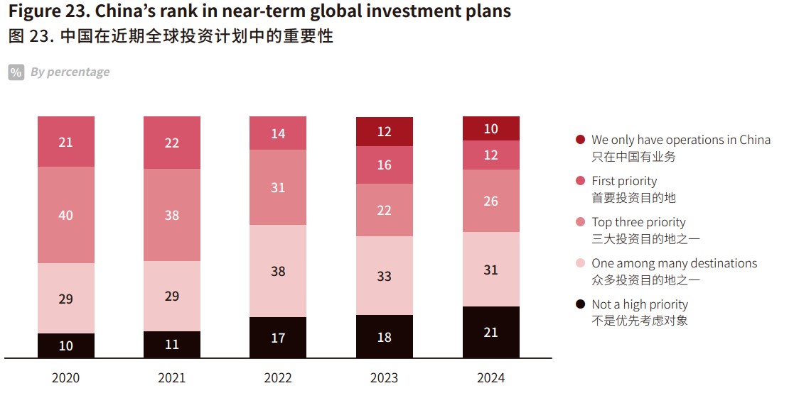 European Business in China Position Paper 2024/2025, estudio de la Cámara de Comercio Europea en China que analiza a fondo el clima de negocios en el país. A medida que aumentan los riesgos de hacer negocios y disminuyen sus retornos, muchos inversores perciben que su enfoque del mercado chino requiere un replanteamiento estratégico. "Para un número creciente de empresas, se ha alcanzado un punto de inflexión, y los inversores examinan ahora sus operaciones con detenimiento, ya que los retos de hacer negocios están empezando a superar a los beneficios", dijo Jens Eskelund, presidente de la Cámara Europea, al presentar el informe, añadiendo: "la situación requiere urgentemente más acción por parte del Gobierno chino, no más planes de acción".
